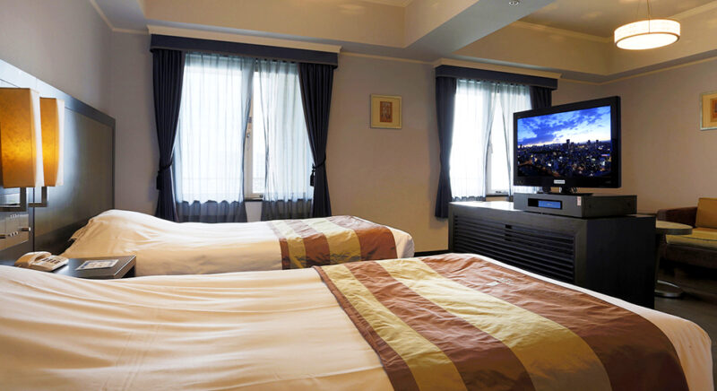 120×203cmのベッドが2台のお部屋です。シモンズ社製マットレスを採用。ウルトラファインミスト「ミラブル」シャワーヘッドとプラズマクラスター搭載の加湿機能付空気清浄機を完備。