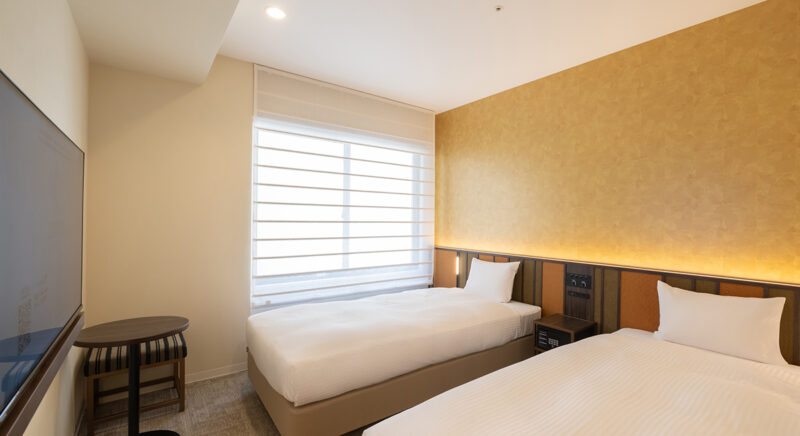 シンプルながら機能的なつくりで、落ち着いた空間のツインルームです。全身をやさしく包みこむオーバーヘッドシャワー付きのシャワーブースをご用意しています。