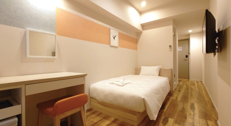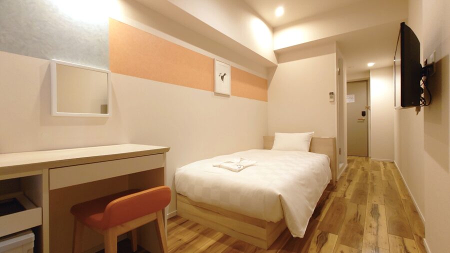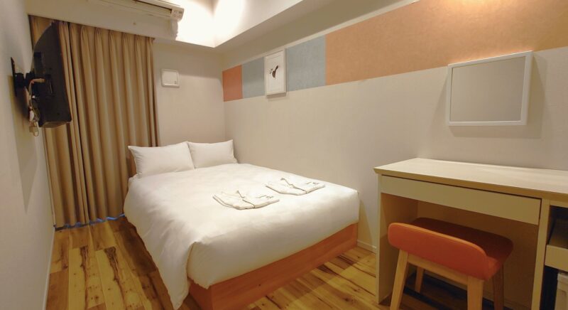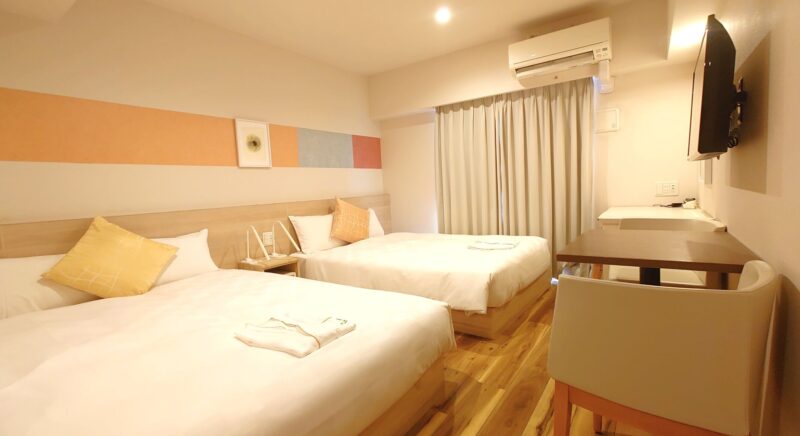 ゆったりとしたベッドは2名までご利用可能。柔らかな色合いの空間が旅の疲れを癒します。