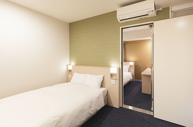 隣接するデラックスツインとダブルルームの間に室内ドアがあり、相互に行き来できる客室。ご家族やお友達同士でのご利用に最適です。サータ社製ベッドを導入、加湿機能付き空気清浄機を完備。