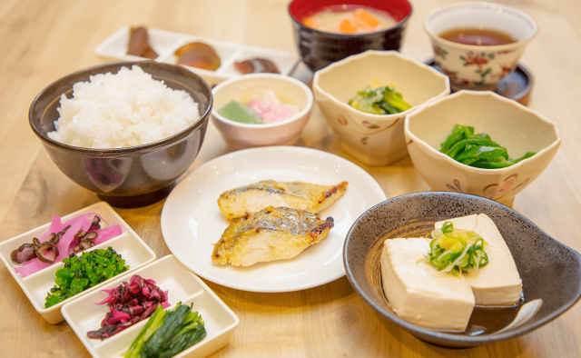 日替わりの京野菜のおばんざいの他、 錦市場よりお取り寄せにて 京都のお漬物やおばん茶をご用意しております。