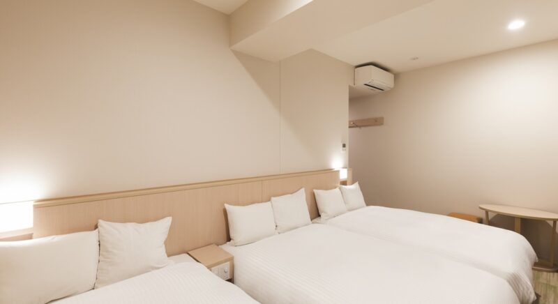 120cm幅のベッド2台とエキストラベッド1台で3名様でご利用いただけます。120cm幅ベッドにはエアウィーヴ製マットレス採用しております。サータ社製ベッドを導入、加湿機能付き空気清浄機を完備。