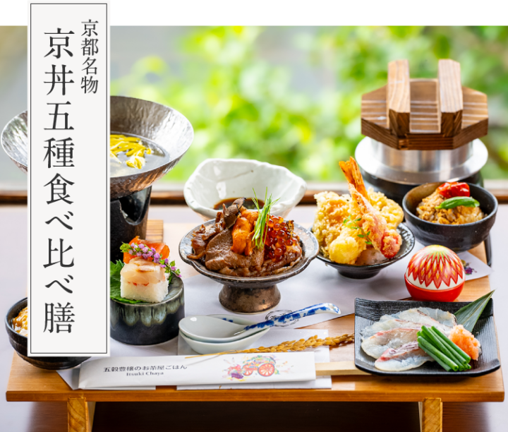 渡月橋のほど近く、中ノ島橋と嵐山公園の間にある「五木茶屋」ではこだわりのお米や京都の野菜を使ったおいしいごはんをいただくことができます。おすすめは「京丼五種食べ比べ膳」。季節ごとの旬の食材を生かした小さい丼が5つ並んで見た目も可愛らしく、心もおなかも満たされます。穏やかに流れる桂川や渡月橋の景観を眺めながらのお食事は極上のおもてなしとなるでしょう。
