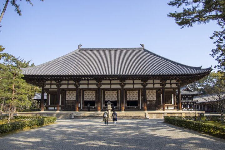 本尊である盧舎那仏(国宝)が安置されている東大寺の金堂で、世界でも最大級の木造建築です。752年に完成して以降、戦火で2度焼失し、その都度再建されてきました。現在の建物は江戸時代に公慶上人によって再建されたもの。盧舎那仏は華厳宗の教主として堂内正面に鎮座しています。像高約15mの堂々としたお姿は、奈良時代から変わらず人々の心の支えとなってきました。両脇に脇侍の虚空蔵菩薩と如意輪観音、背後に四天王の広目天と多聞天が控えています。
