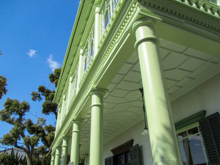 1903年アメリカ総領事ハンターシャープ氏の邸宅として建築された洋館です。その名のとおり萌黄(もえぎ)色の外壁に包まれていますが、長らく外壁は白に塗られており「白い異人館」と呼ばれていましたが、1962年からの修理で建築当時の淡いグリーンに復元されました。2階のサンルームからは、神戸の美しい街並みを楽しむことができます。1980年に国の重要文化財に指定されました。