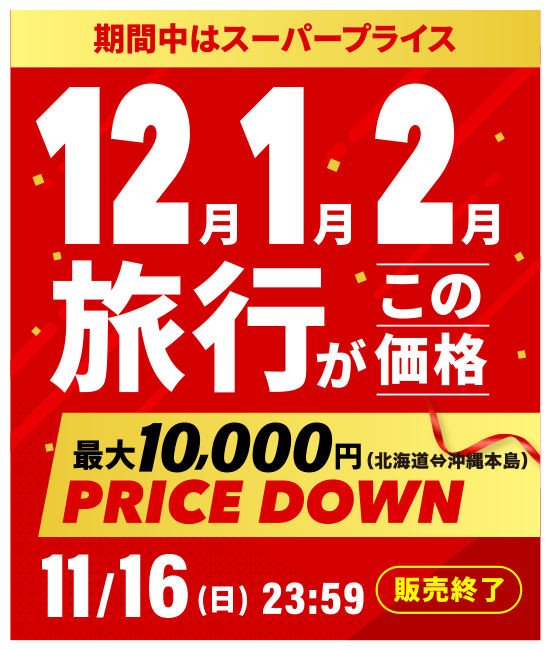 - 2025/10/27~11/9 (日)23:59までの受付限定!12月~2月出発限定のスーパーセール開催!早期予約でお得に旅スタンバイ♪