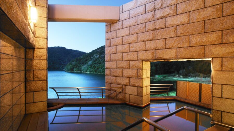 大きな窓から望む湖面はまるで浴槽に繋がっているかのような感覚。浴室内は自然の景観を壊す事のない様に、自然の天然木や自然石を使用しております。