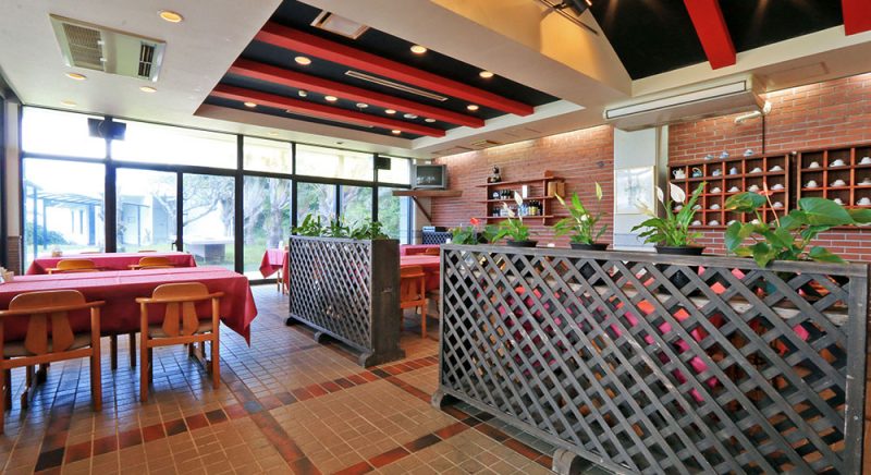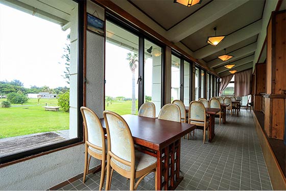 淡いブルーが基調の明るいレストランです。海側にありますので景色を眺めながらの食事に最適です。
