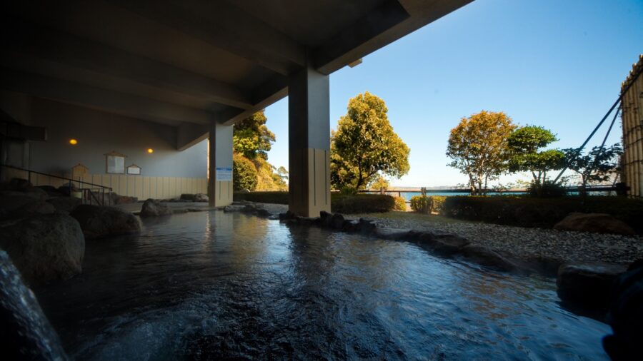 露天温泉岩風呂「日出温泉」は、敷地内に泉源を持つナトリウム塩化物泉。別府湾の眺望を楽しみながら、旅の疲れをほぐしてくれます。約15種類のシャンプー・コンディショナーが選べるシャンプーバー&サウナも完備。※写真は大浴場