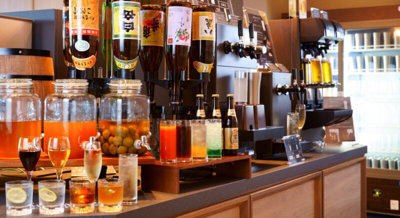 夕食時、地産地消のお料理と豊富なメニューのアルコール飲み放題付きです。