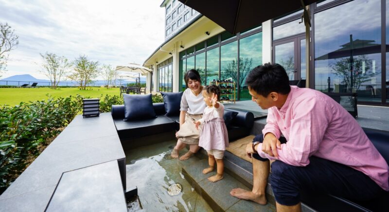 屋外の足湯で潮風を感じながら別府湾を眺められます。