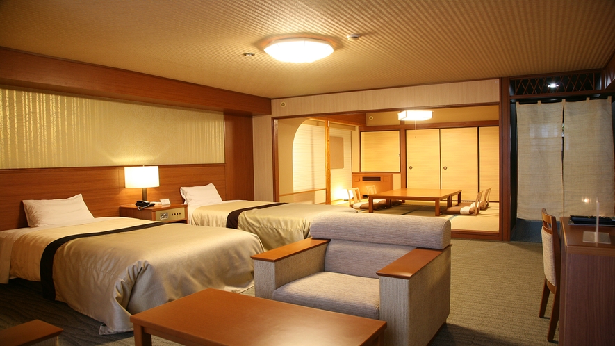 広々とした54平米のお部屋は8畳の和室と、ツインベッド+ソファー付洋室の二間の設え。居住性のある寛ぎの空間です。また、ホテルは霧島連山の中腹に位置し、全室南向きのため、 遠く錦江湾や桜島の見事な眺望をお楽しみいただけます。
