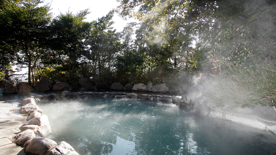 露天風呂は緑濃い森に囲まれた情緒ある風情です。 お湯はもちろん100%天然温泉です。