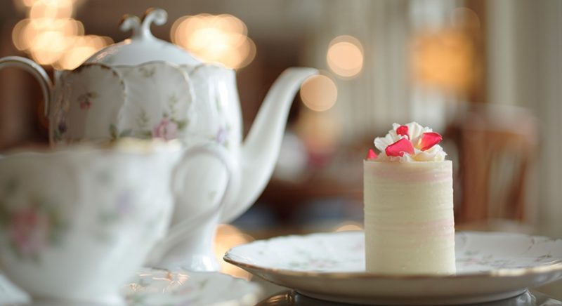 運河を臨む、花と音楽に囲まれた開放的なティーラウンジ。