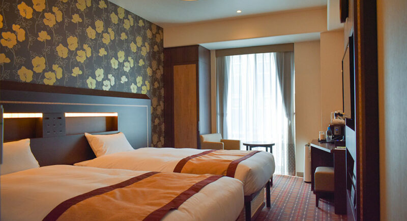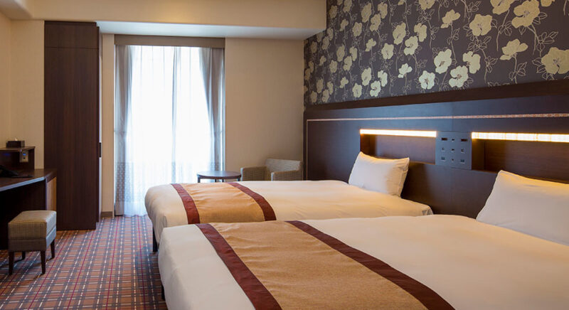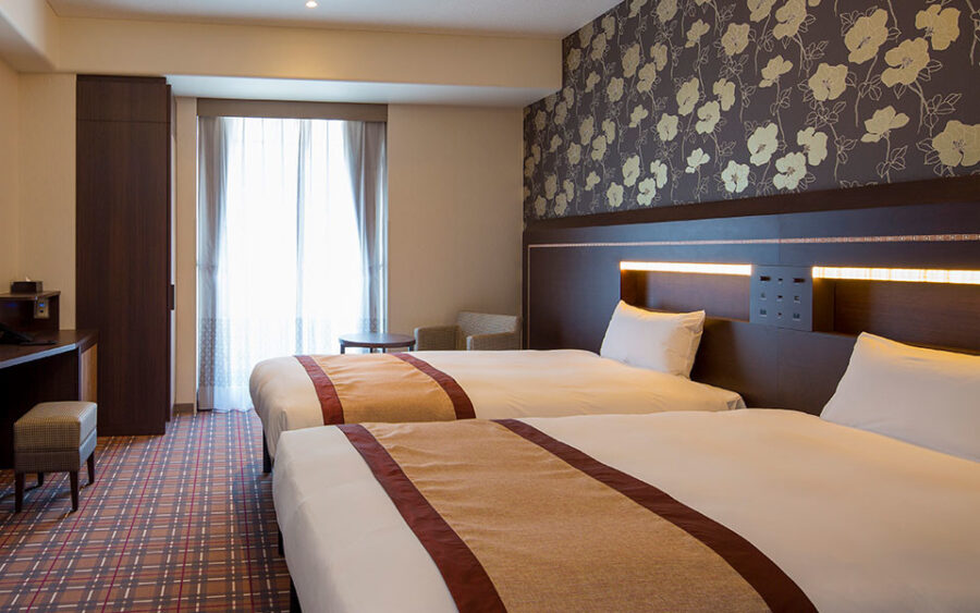 全室禁煙、シモンズ製ベッド、ゆったりくつろげるベッド幅120cm(2台)、室内のシャワーヘッドには「ミラブル」を導入