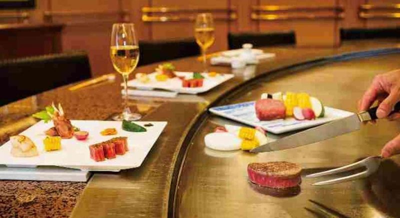料理長が厳選した牛肉や魚介類を、お客様にお前で調理いたします。最上階から眺めるハウステンボスとその先に広がる大村湾も格別です。