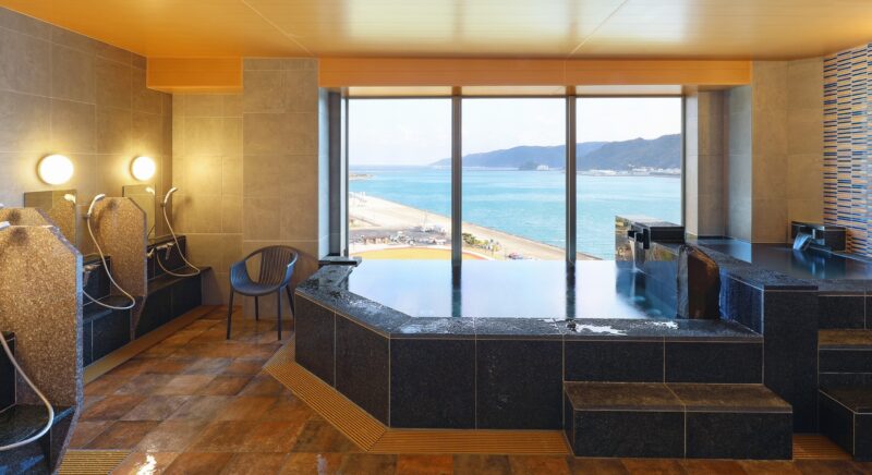 名瀬湾の海を眺めながら、絶景を楽しめる展望風呂です。