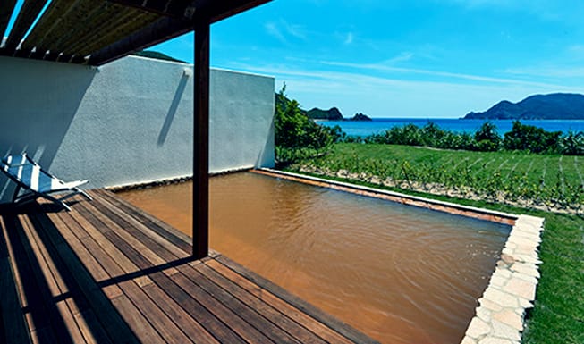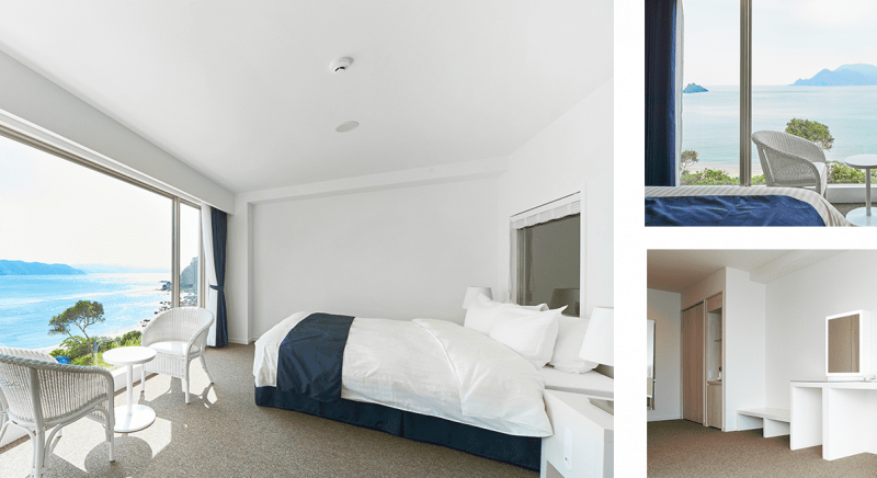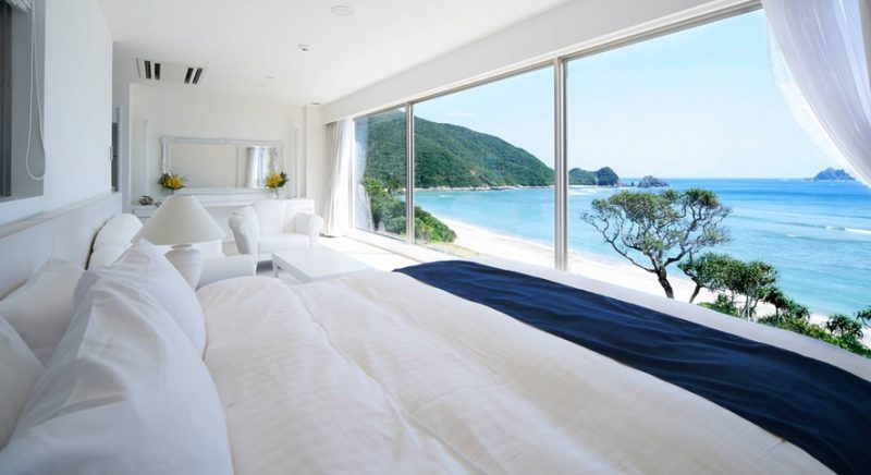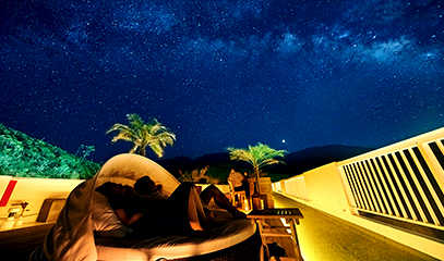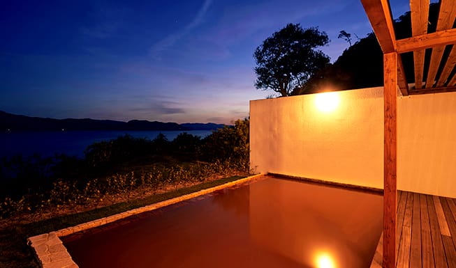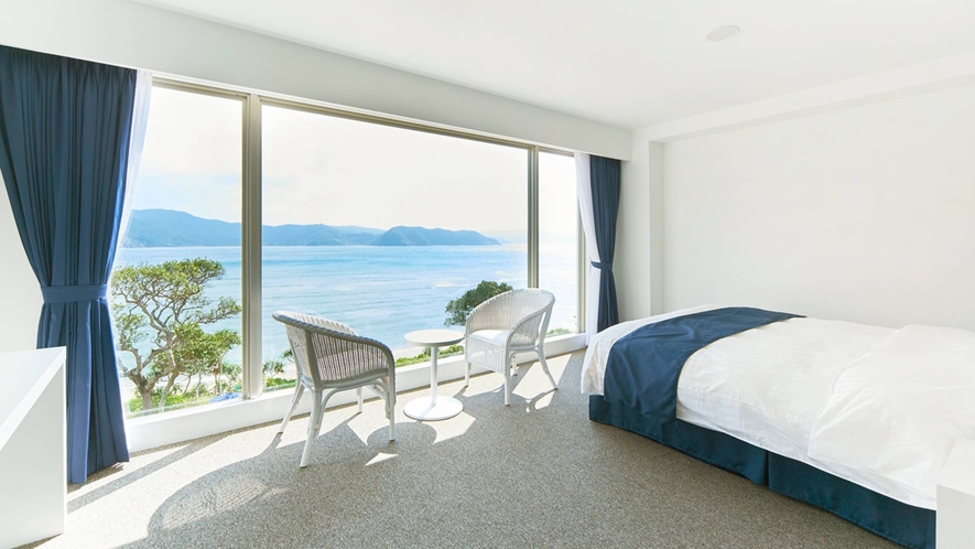 客室内は、全室海に面する一面がガラス張りのオーシャンビュー。晴れた日には美しく輝く大島海峡や加計呂麻島を、夜には一面の星空を見渡すことができます。