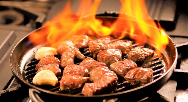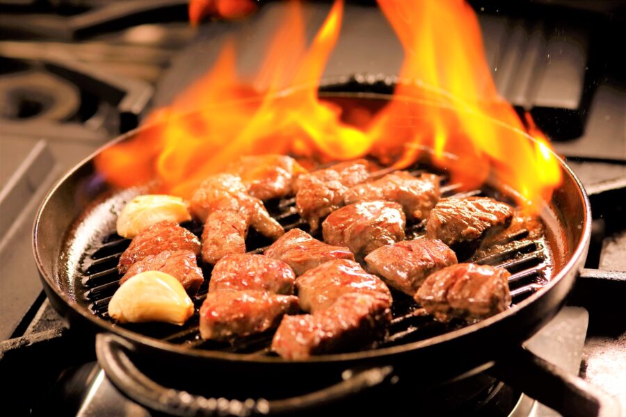 朝からサイコロステーキをたくさん食べて、一日の活力アップに!