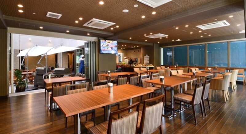 吹き抜けが心地良いテラスで、ステーキ食べ放題朝食をお召し上がりいただけます。
