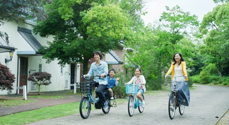 自転車で敷地内あパークを散策。コテージ前に駐輪できるので気軽にサイクリング頂けます。