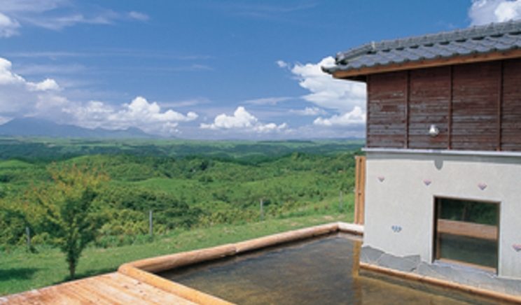 緑の野原を見渡せる「満天望温泉」露天風呂。満天の星空が広がる夜の入浴がおすすめです。都会では決して体験することができない贅沢です。