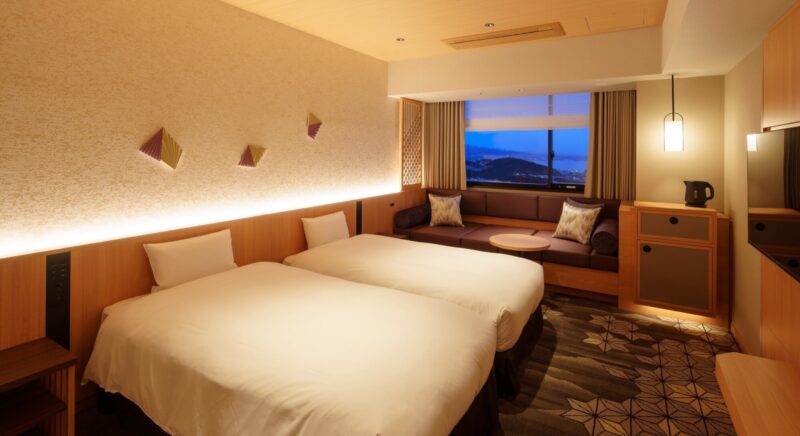 カジュアルでありながらシンプルすぎず、別府の海と山、咲き誇る花をモチーフにした宿泊棟です。ご友人様同士や小さなお子さま連れのご家族に最適なツインルーム。