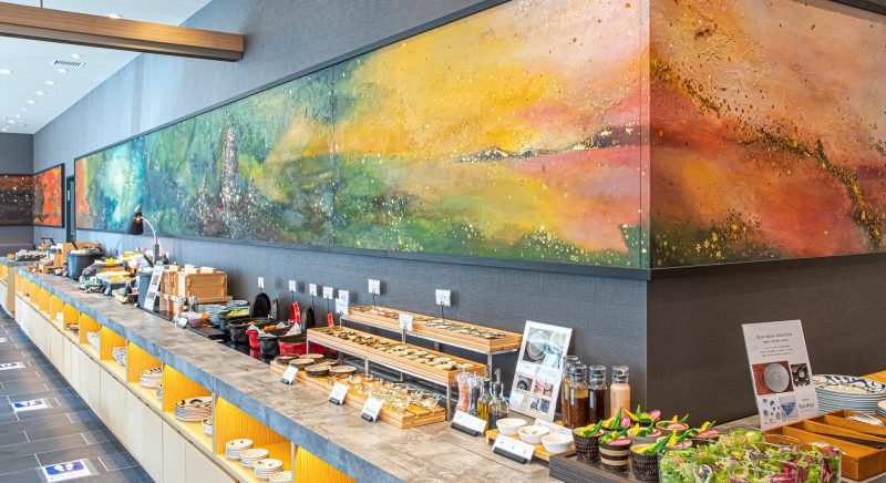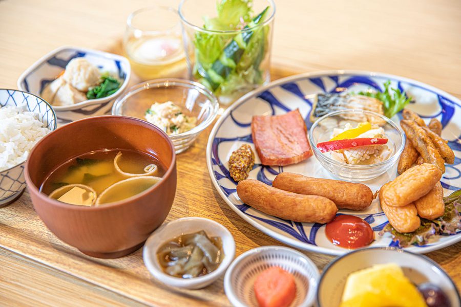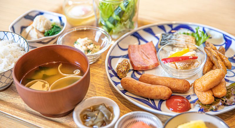 地元名産の食材をふんだんに使用し、「水炊き」「明太子」を筆頭にB級グルメ「焼きラーメン」、一般家庭の食卓の定番「がめ煮」「おきゅうと」といった、地元の郷土料理を中心に、チキン南蛮、角煮、さつま揚げといった九州各県の名物料理やお子様にも人気のスクランブルエッグやウインナー、パン、デザートまで約70種をご用意。