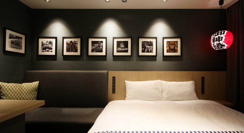 山笠の写真や博多提灯など、中洲らしい「和」の雰囲気のあるお部屋です。ベッド:1台 (1610cm×L1950cm)。