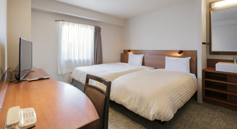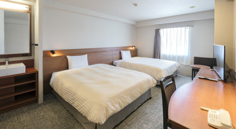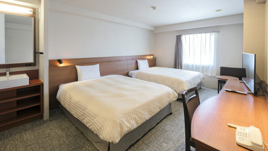 150cm幅ベッドのツインルームです。客室は26㎡でゆったりとした広さで、ご家族での宿泊も余裕です。