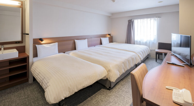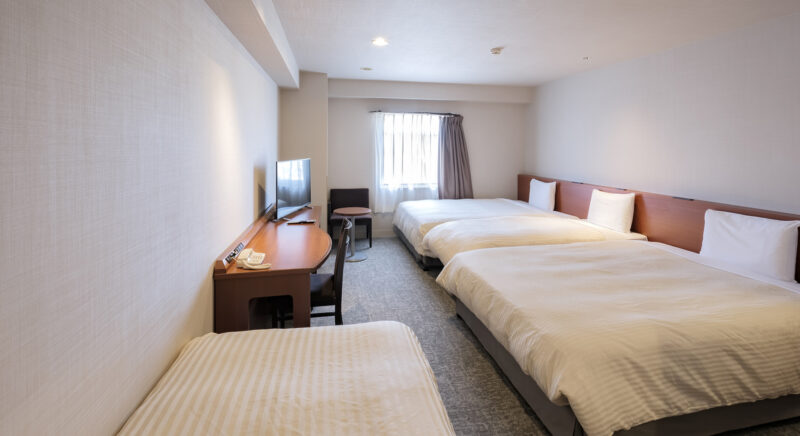 150cm幅のベッドと、90cm幅のベッドが1台設置の客室。2~3名宿泊に余裕の広さです。