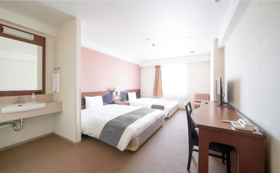 150cm幅ベッドのツインルームです。客室は26㎡でゆったりとした広さで、ご家族での宿泊も余裕です。