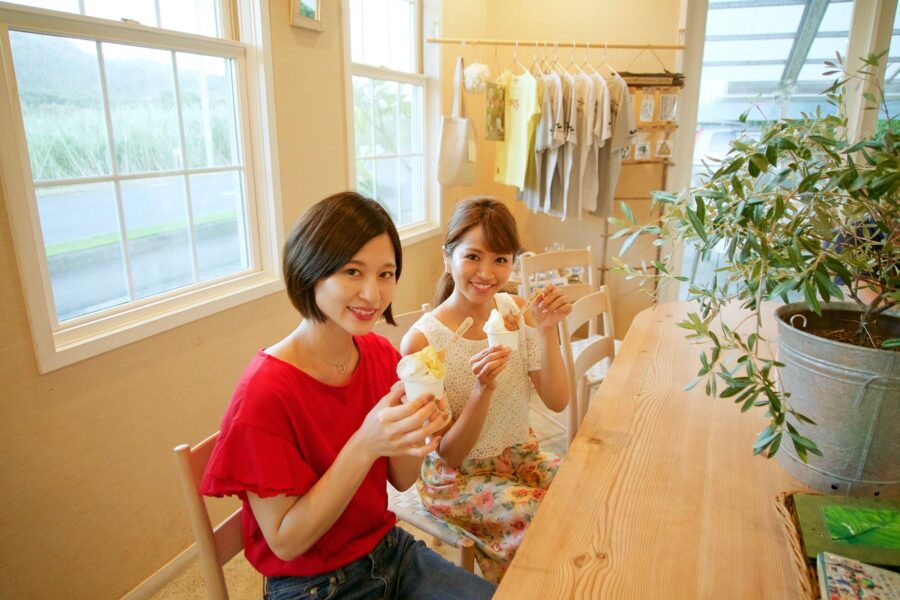 敷地内併設「みしょらんCafe」では、牧場直送の牧場ミルクを使った濃厚なソフトクリームや、島豚を使った奄美の伝統食「塩豚」バーガーがおすすめ!
