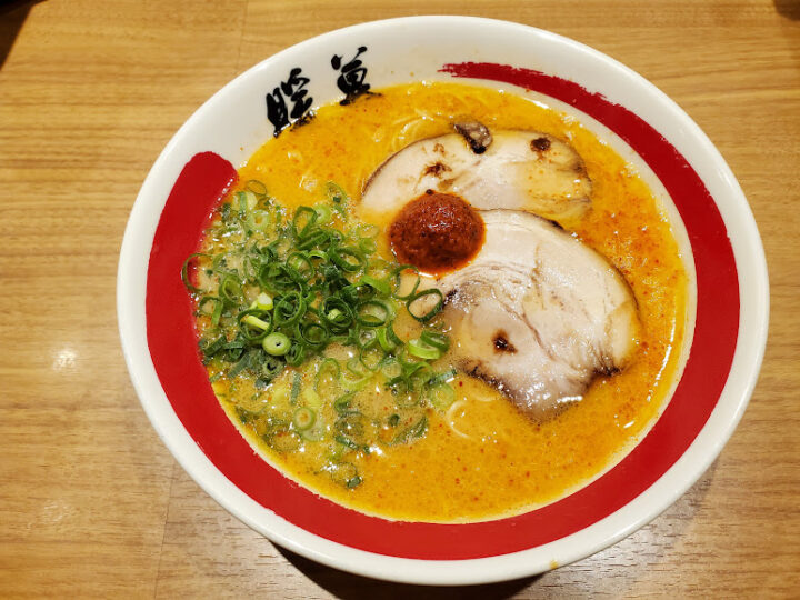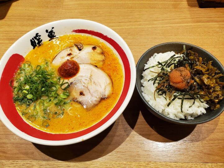 濃厚かつスッキリした味わいのスープが細麺と絡みあう至福の1杯。高菜&明太子ごはんに替え玉もお忘れなく!