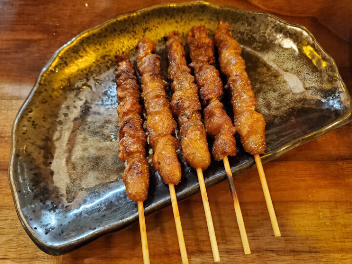 地元っ子行きつけの居酒屋でまずは鶏皮くしを注文!一人10本は余裕なんだとか。