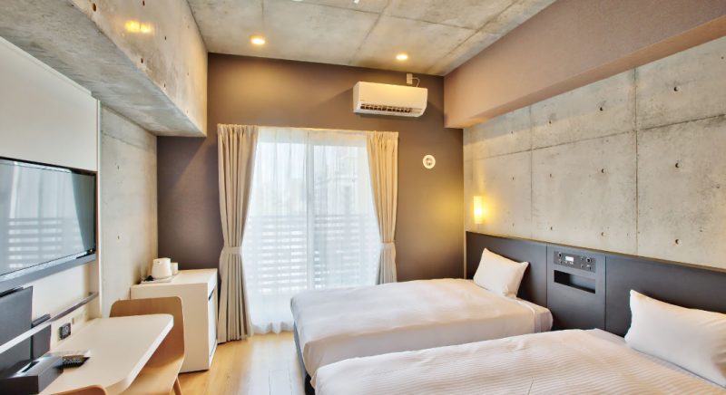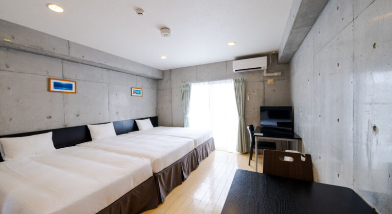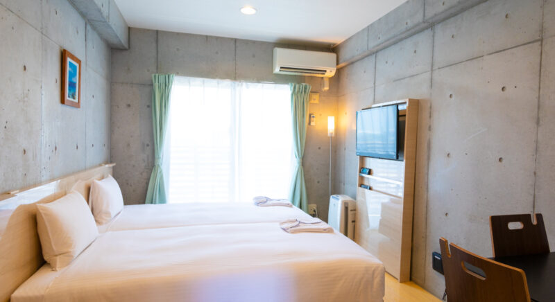ハリウッドツインにした客室。ミニキッチン、電子レンジ、洗濯機常設。沖縄移住したような居心地の良さで長期滞在に最適です。(バス・トイレ別)