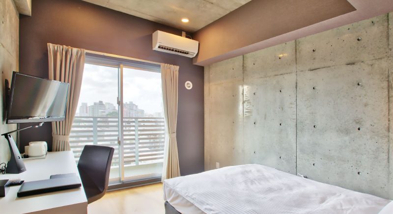 コンクリート打ちっぱなしのスタイリッシュなデザインと中長期滞在にも対応できるレジデンスホテル。全室バス・トイレ別でバルコニー付きが魅力的!