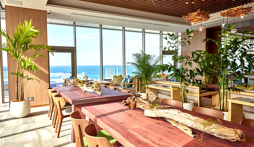 開放感溢れるラウンジで青い海と広い空を満喫していただけます。やんばるのぬくもりと共に絶景を見ながらのワーケーションもおすすめ