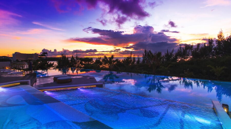 西海岸の海が眼下に広がるオーシャンビュー。バルコニーとジャグジーを全室に備え、沖縄の自然をオールシーズン体感できるリゾート