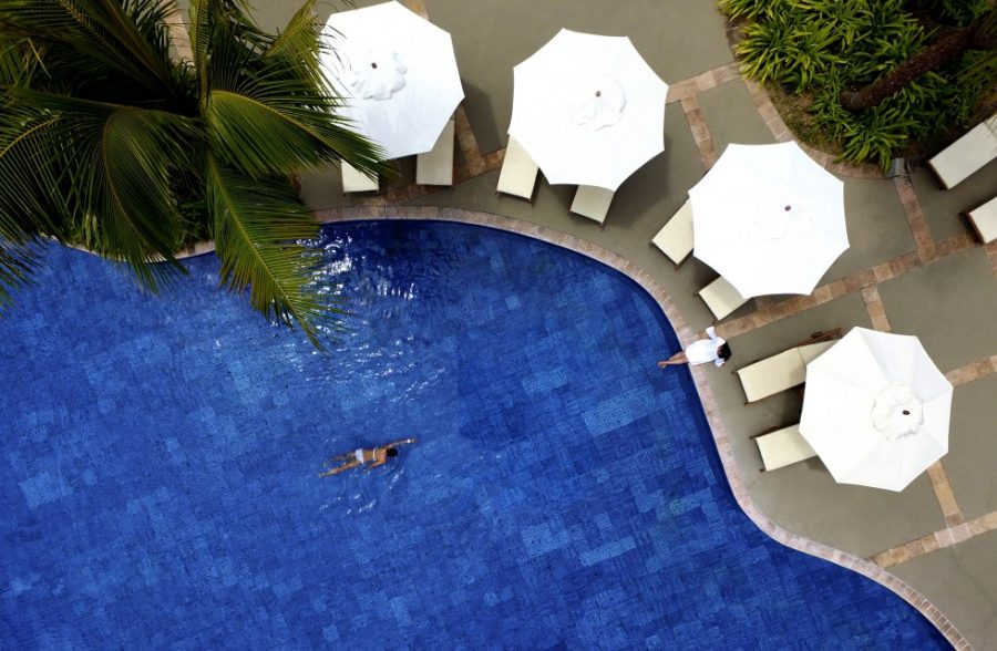 上段と下段の2つのプールがあり、下段にはウォータースライダーも設備。 サンセットタイムには、プールサイドでサックスの生演奏を行っております。
