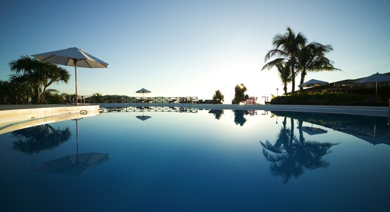 爽やかな風が吹くガーデンプールで、水とたわむれ、水中に流れるヒーリングミュージックで心身ともにリラックス。
