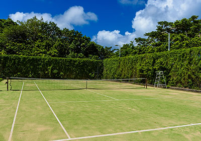 ナイタープレーも可能なオムニサンドグラスのテニスコートは全天候型。スコールが来ても20分後にはプレーを再開できます。
