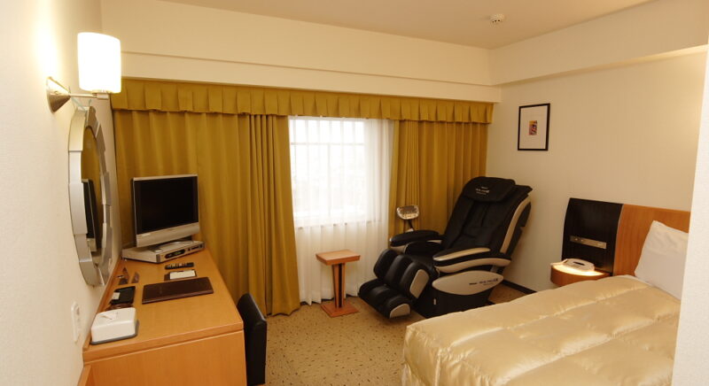 一人でゆったりできるセミダブルベッドと、高性能マッサージチェアで、旅やビジネスの疲れをリフレッシュ!