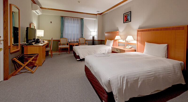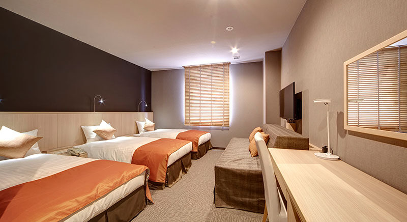 シャンプー・リンス、ボディソープ、石鹸、タオル・バスタオル、ハミガキセット、くし・ブラシ、ドライヤー、髭剃り、バスローブ、スリッパ、冷蔵庫、お茶セット(無料)、有料放送広さ 部屋タイプ 定員 23.7m² トリプル 3名様