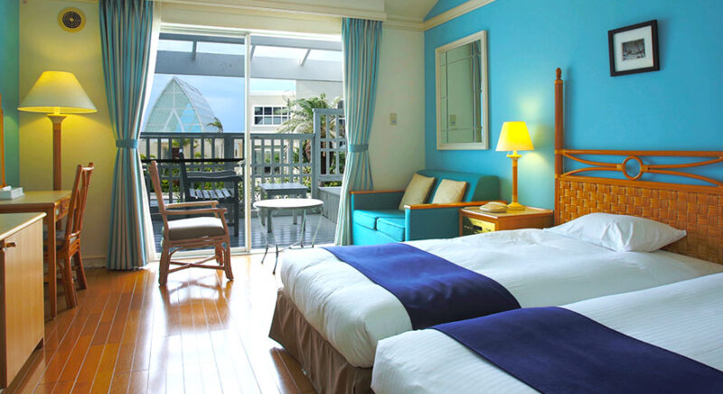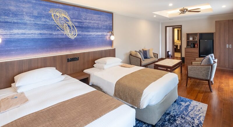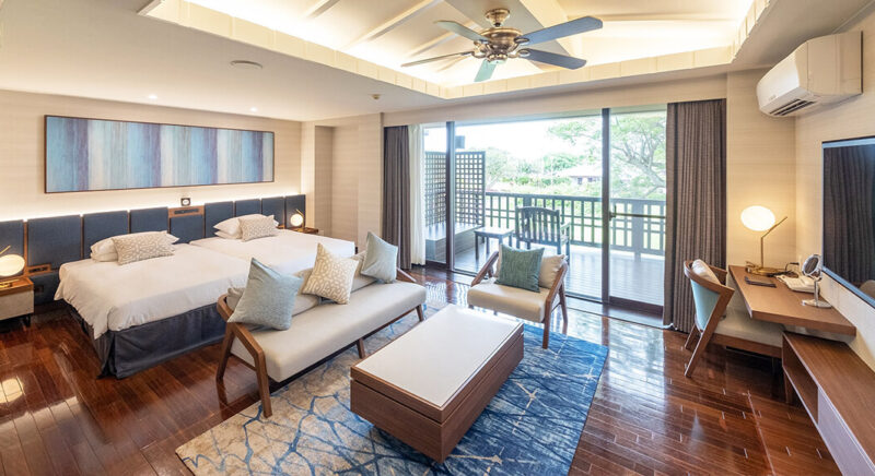 オクマの碧い海と白砂のビーチを表現した、ブルーとホワイトを基調とした明るく開放的な室内。ビーチで過ごすようなリゾートタイムを客室でも。