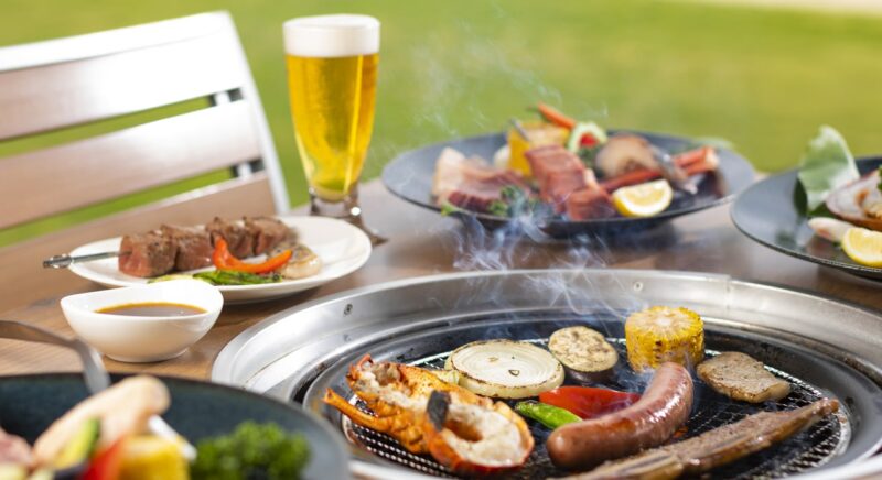 東シナ海に沈むサンセットを見ながら食す特別な時間。賑やかに卓を囲むバーベキューはアメリカンスタイルで。