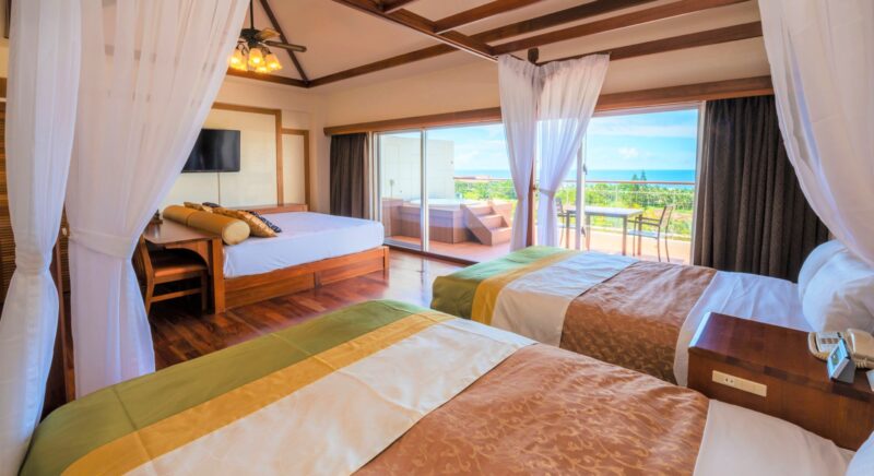 天蓋付きベッドとデイベッドでゆったりとした空間を演出。楽園の景色を一望できるバルコニーには広いジェットバスが。