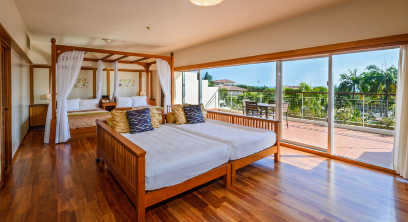 大きめにとられた窓からは明るい日差しと楽園の美しい景色が。天蓋付きベッドが高級感を演出します。