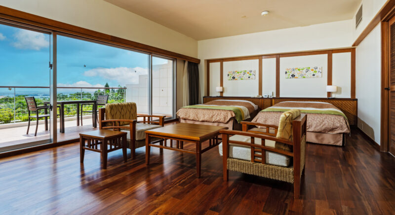 大きくとられた窓から明るい日差しが差し込む。バルコニーは広々25.92平米。視線の先には美しい楽園の景色が。