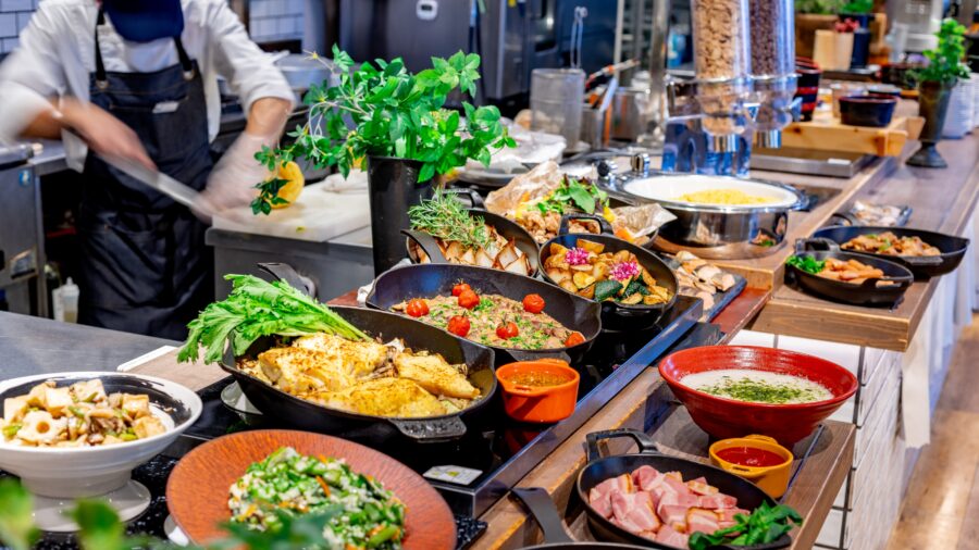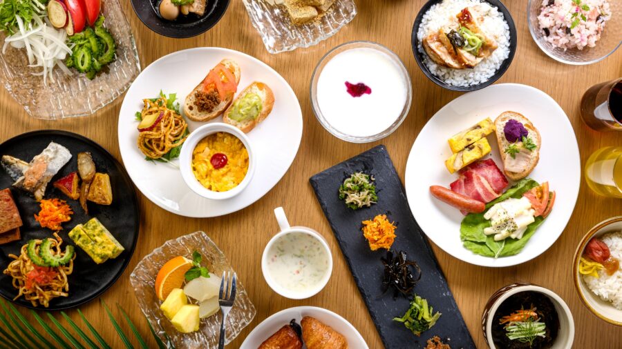 沖縄の風土を感じる地産地消の食材、季節ごとの旬の食材をふんだんに使った、和と洋の料理をビュッフェでお届け。
